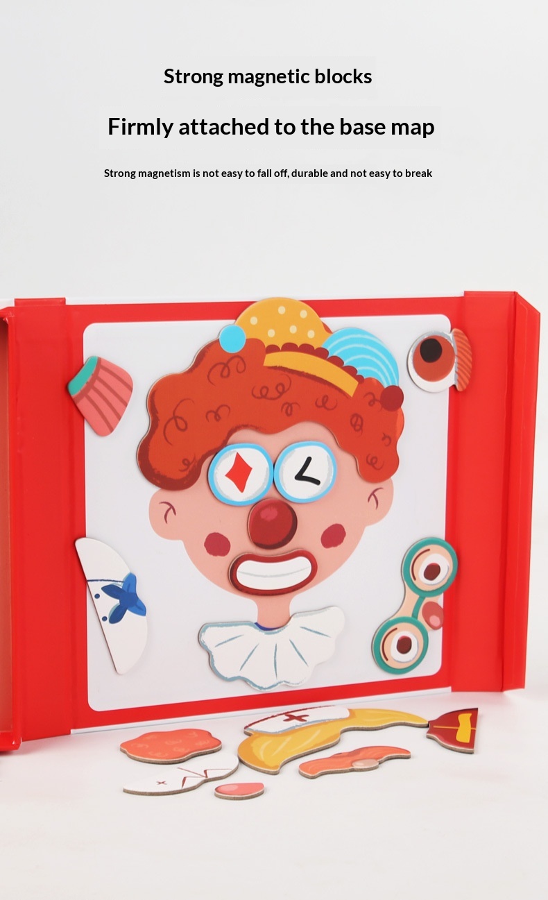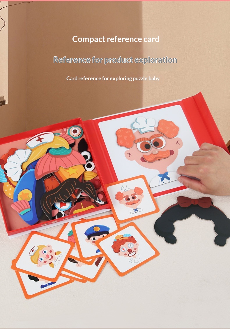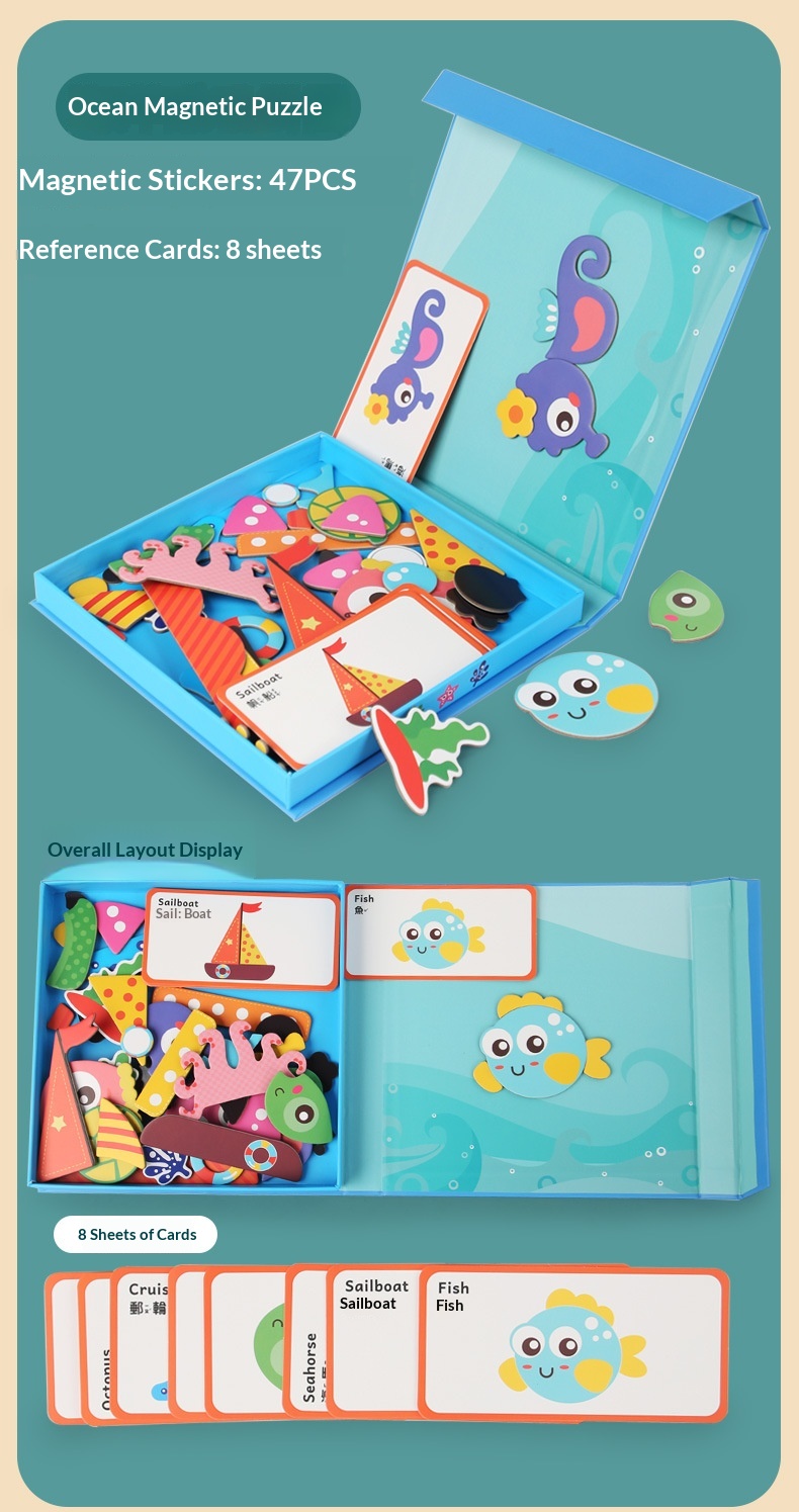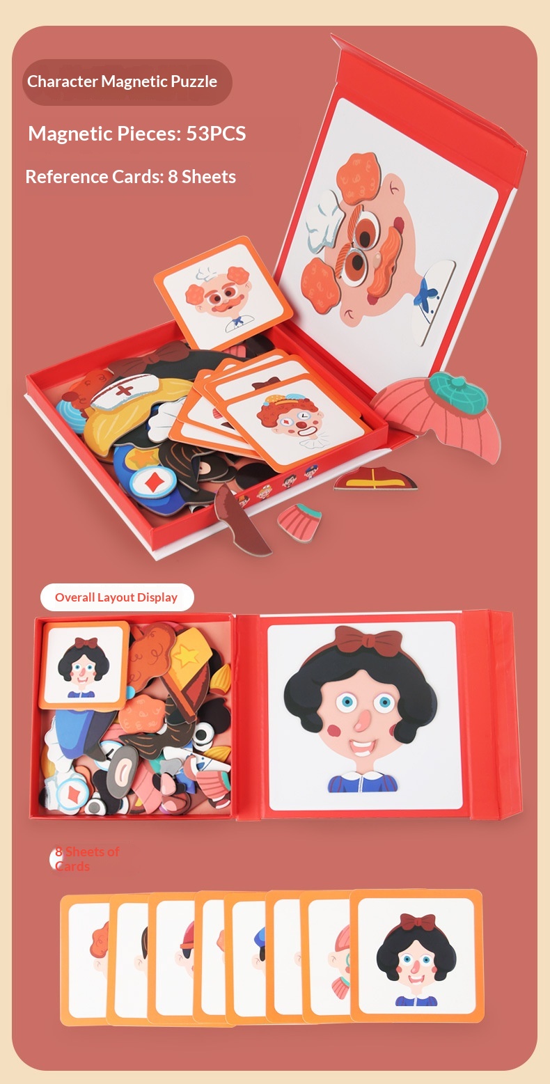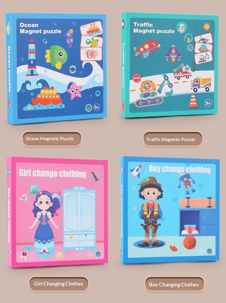 Colors: Magnetic stickers with facial features, magnetic puzzles with character themes, magnetic puzzles featuring vehicles, magnetic dress-up puzzles with a princess theme, magnetic puzzles with career themes, magnetic puzzles with an ocean theme, magnetic dress-up puzzles with a boy theme.