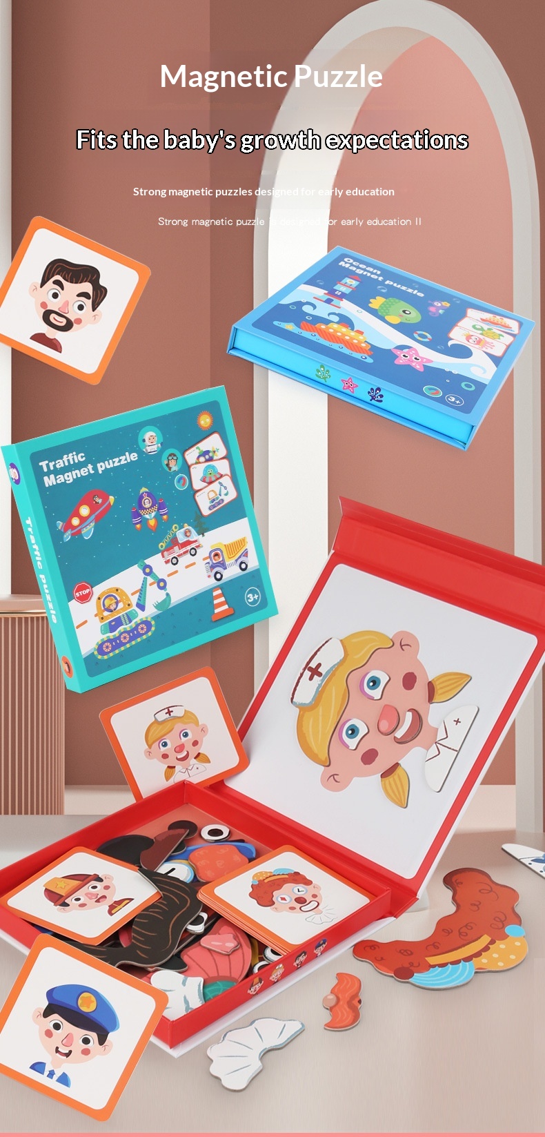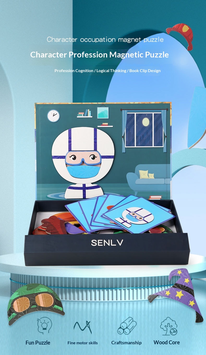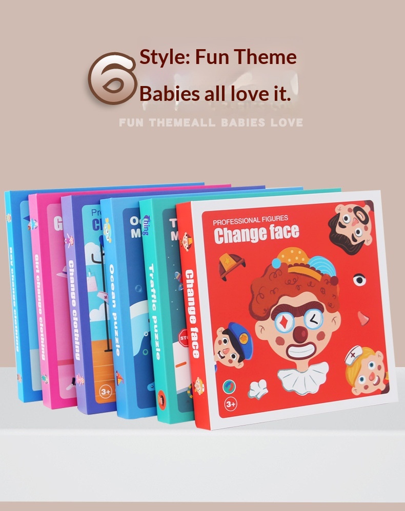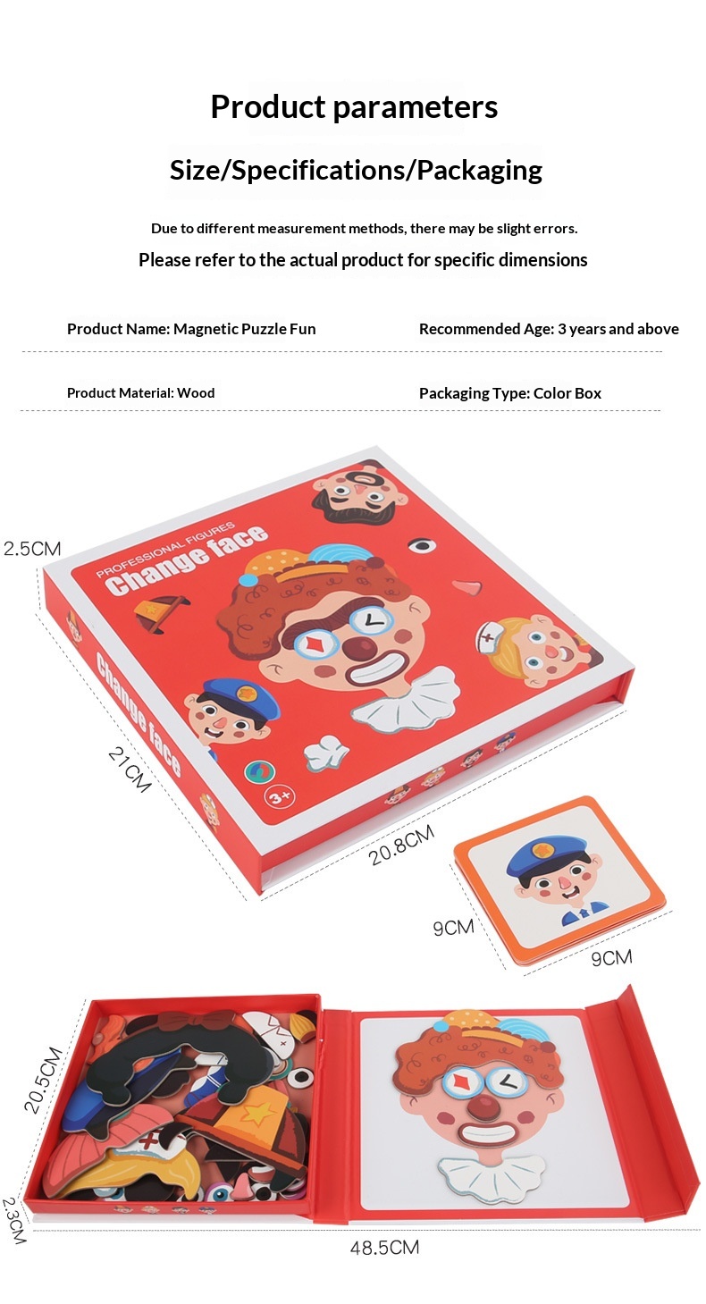 Colors: Magnetic stickers with facial features, magnetic puzzles with character themes, magnetic puzzles featuring vehicles, magnetic dress-up puzzles with a princess theme, magnetic puzzles with career themes, magnetic puzzles with an ocean theme, magnetic dress-up puzzles with a boy theme.