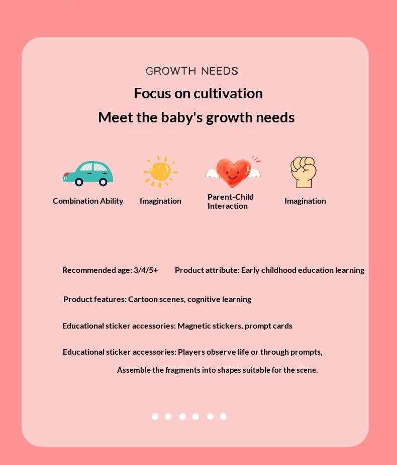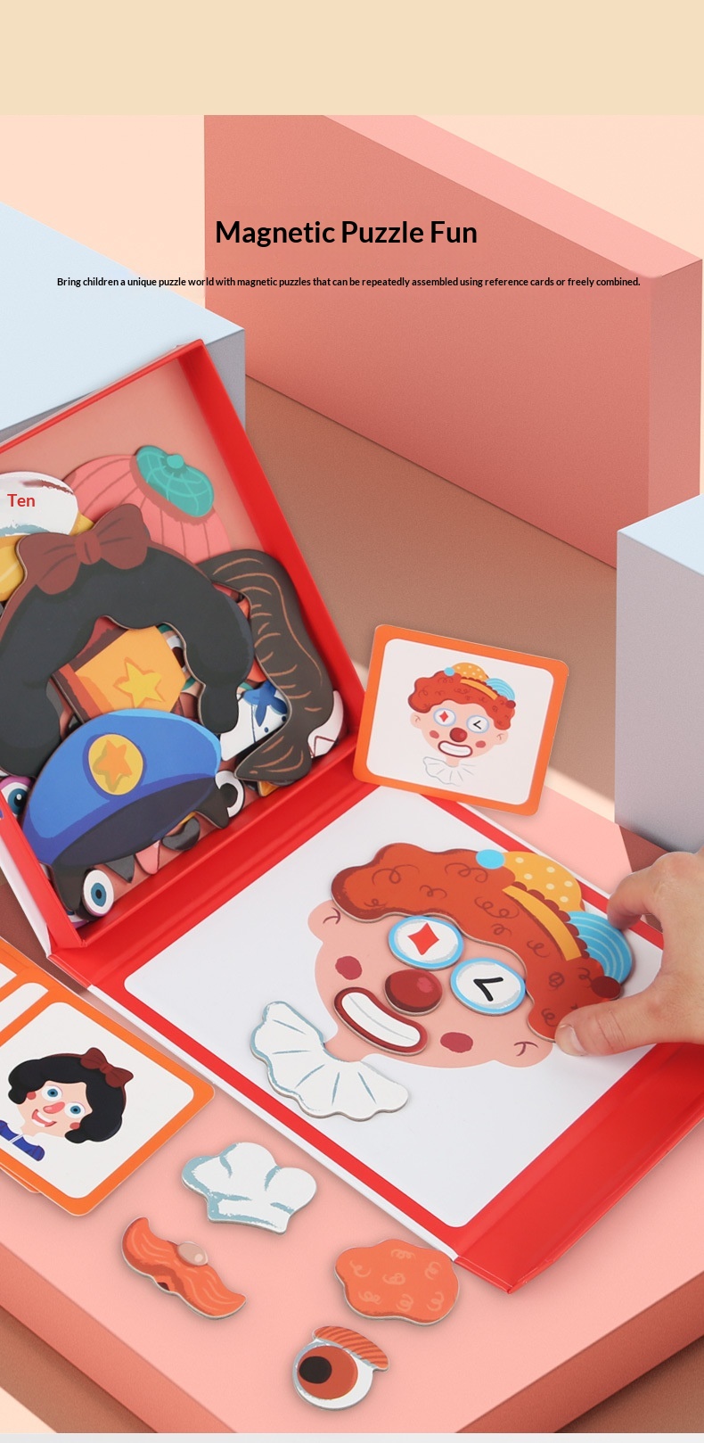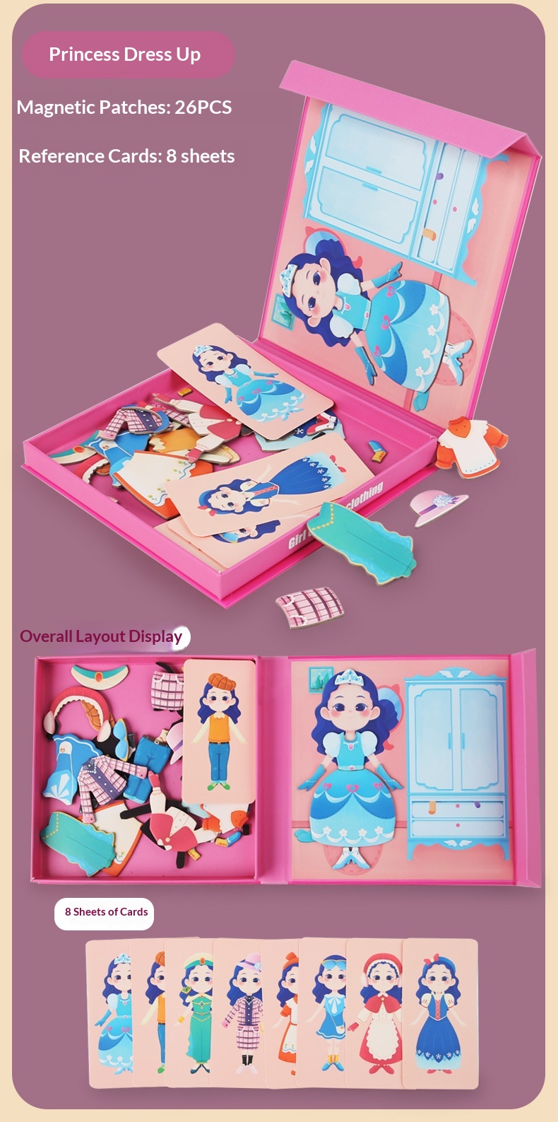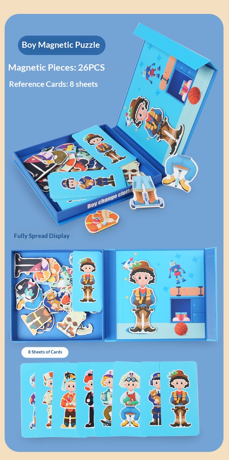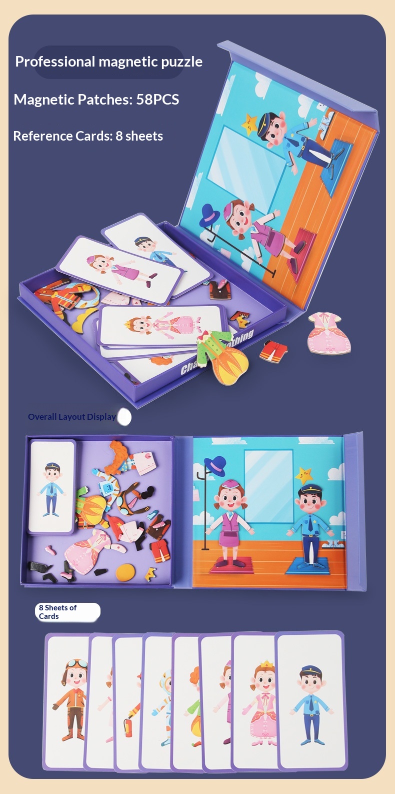 Colors: Magnetic stickers with facial features, magnetic puzzles with character themes, magnetic puzzles featuring vehicles, magnetic dress-up puzzles with a princess theme, magnetic puzzles with career themes, magnetic puzzles with an ocean theme, magnetic dress-up puzzles with a boy theme.