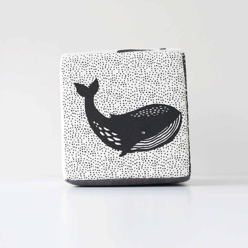 The Soft Block featuring whale, octopus, shell, fish, and ocean waves, has so much to do and see. This soft bouncy fabric block is designed to delight baby's developing senses with high-contrast graphics, textures, taggies, and crinkles. Featuring six sides of signature Wee Gallery illustrated ocean life and animals.