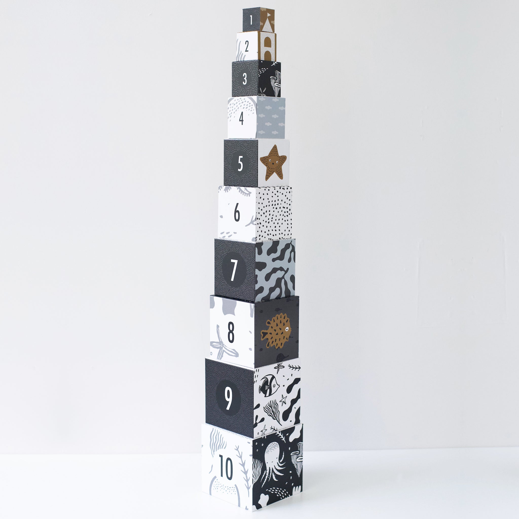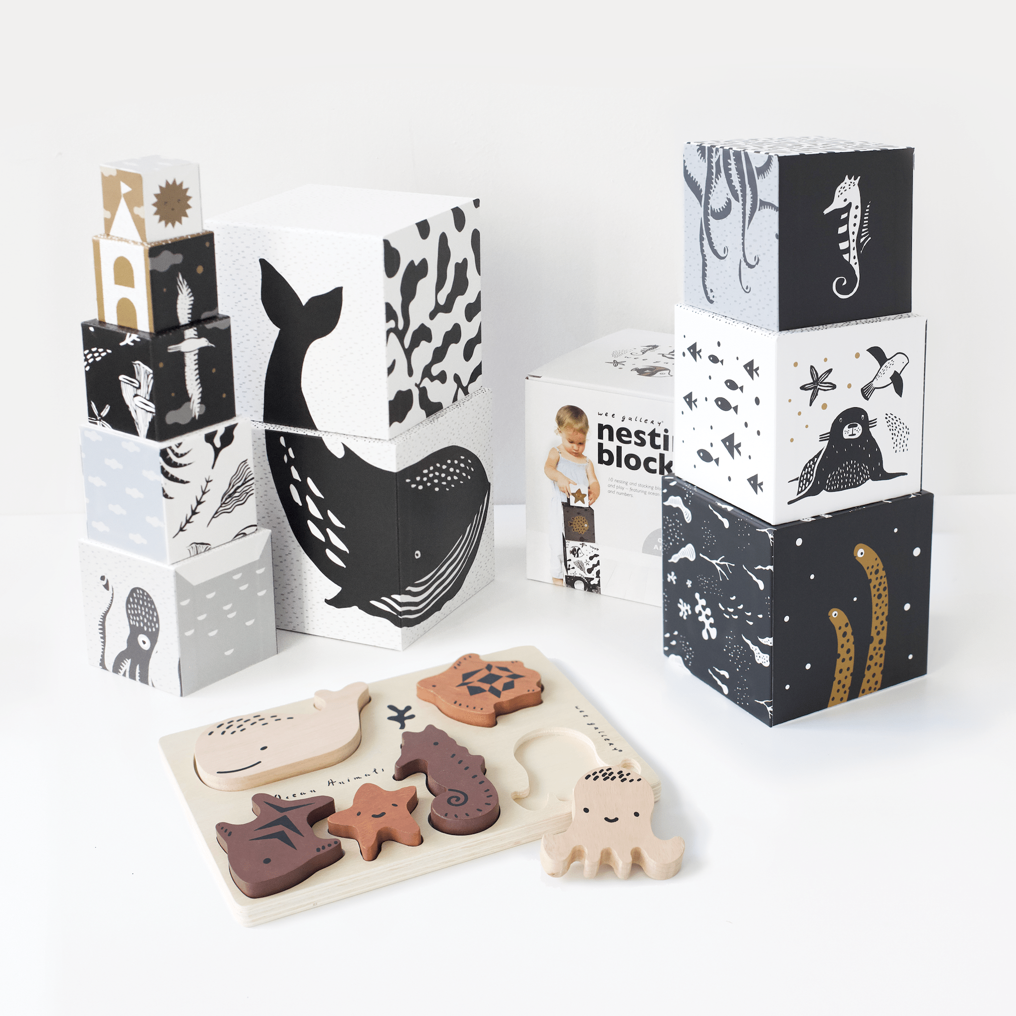 Ocean Nesting Blocks: Made of FSC certified sturdy board. Keep away from water. Can be wiped clean with a lightly damp cloth.